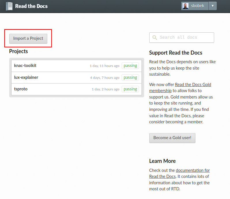 - Na stronie ReadTheDocs kliknij “Import Project” i wybierz swój projekt z GitHub