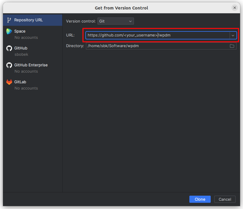 Sklonuj repozytorium z wykorzystaniem CLI lub bezpośrednio z PyCharm i skonfiguruj, aby PyCharm korzystał z wcześniej utworzonego środowiska wirtualnego.